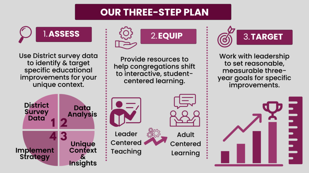 Current District surveys indicate that many critical “best practices” in education—such as student-centered instruction and interactive learning—are largely absent in our adult learning endeavors. While congregations desire an increase in participation, a supportive attitude alone is not enough to create change. We must act now to shift from information transfer to spiritual transformation.